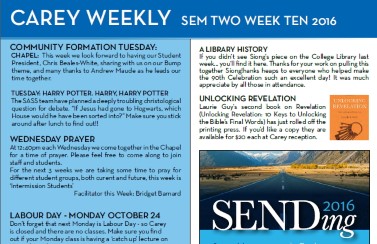 Wow, this semester is ripping on by! Make sure you come along to SENDing next thursday, buy yourself a copy of Laurie's new book, and wear your Potter gear for lunch tomorrow!